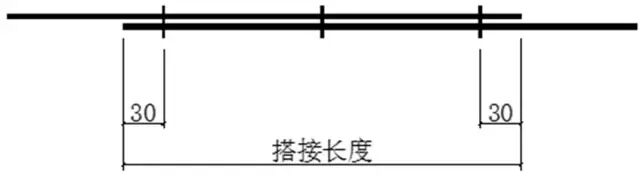 每根钢筋在搭接长度内必须采用三点绑扎。用双丝绑扎搭接钢筋两端头30mm处,中间绑扎一道,且过三道竖向筋。