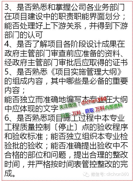 3、是否熟悉和掌握公司各业务部门在项目建设中的职责职能界面划分;能否处理好上下游关系,并得到下游部门的认可