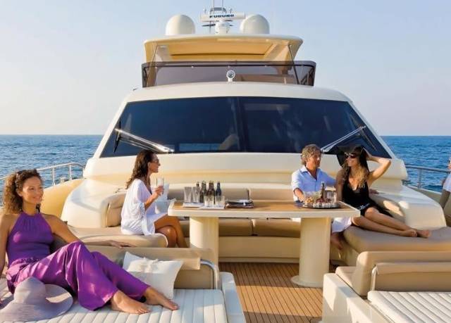 正在这时,你看到一位衣着体面的男士正挎着一位年轻女孩的手沿着码头走上前来。只见那人脚蹬一双Gucci皮鞋,下身是白色休闲裤,上身是蓝色的Burberry运动夹克,打着一条真丝领带,他那年轻的女友则穿着真丝紧身衣,戴着大大的太阳镜,耳朵上挂着一副硕大的钻石耳环。