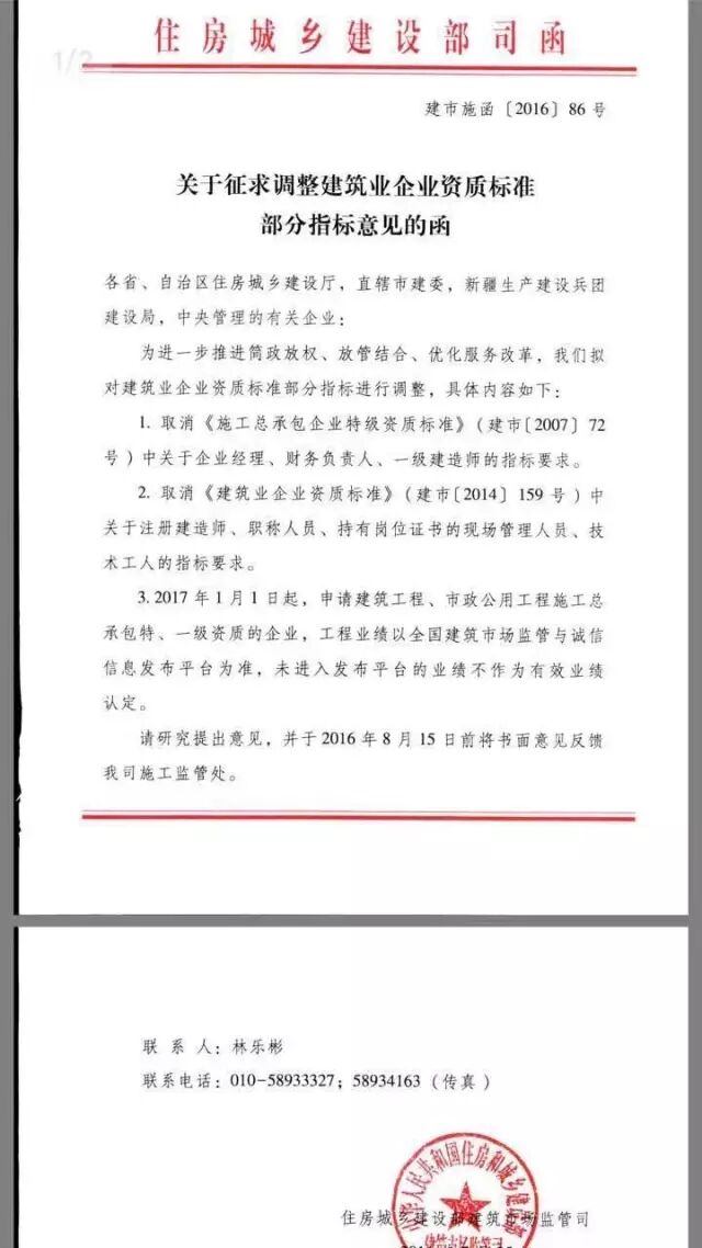 近日,住房和城乡建设部建筑市场监管司就“调整建筑业企业资质标准部分指标”征求意见(建市施函[2016]86号),主要内容有以下两点: