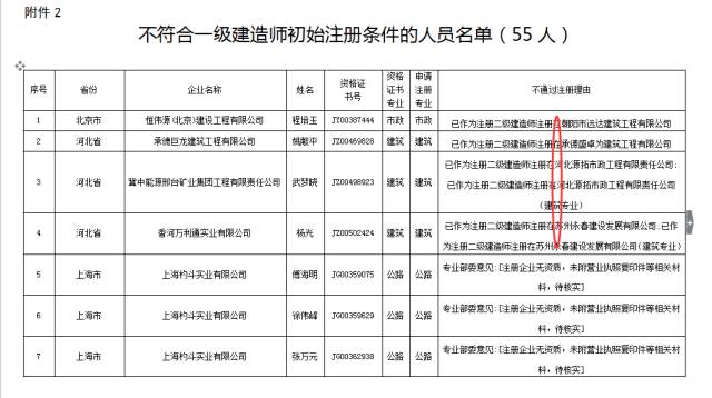 根据2017年住建部《关于2017年度第四十三批一级建造师注册人员名单的公示》中显示,不符合一级建造师初始注册条件的人员总共有55人,其中43人均因为二级建造师或注册造价工程师等其他证书没有注销,导致一级建造师注册失败。