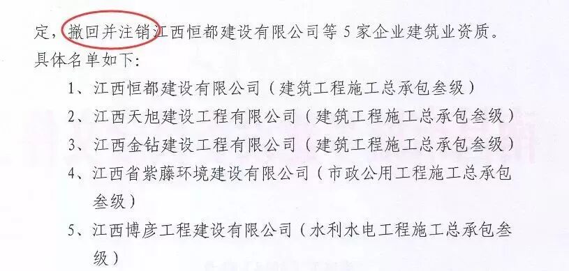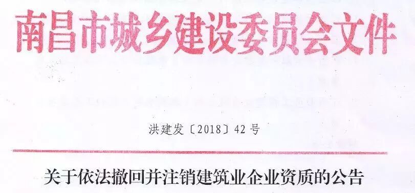2018年4月,5家建筑企业在资质动态核查中,因建造师人员数量等不再满足资质标准要求,其资质被南昌市城建委撤销。