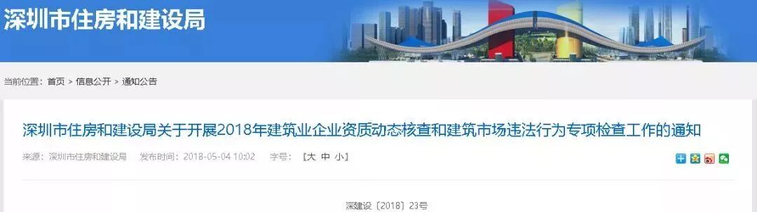 5月4日,深圳市下发《关于开展2018年建筑业企业资质动态核查和建筑市场违法行为专项检查工作的通知》,明确:
