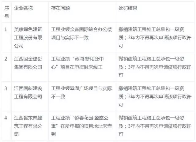 住建部对资质申报和资质核查过程中涉及到业绩弄虚作假的企业的处罚已经越来越严厉,2018年初,就已经连续公布了以下四家建企因业绩问题被撤销施工总承包一级资质。