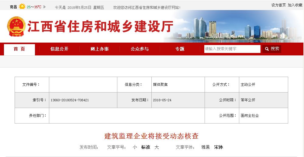 南昌日报5月24日讯(王纪洪 记者 张代艳)记者从省住建厅获悉,我省将采取“双随机一公开”方式,在全省开展2018年建筑业企业和监理企业动态核查。