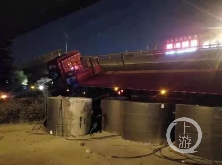▲无锡塌桥现场,大货车旁疑似散放着至少四匝大型钢材。图片来自网络