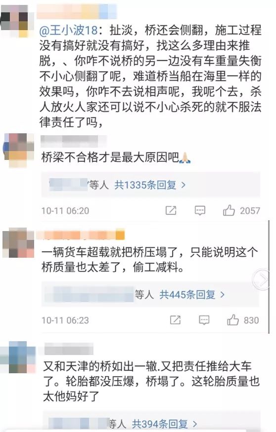 有谴责超载者的,还有人造谣说四车重达400吨,压垮了大桥。@江苏网警 已在官方微博辟谣,因造谣、传谣,多人被捕、被传唤。