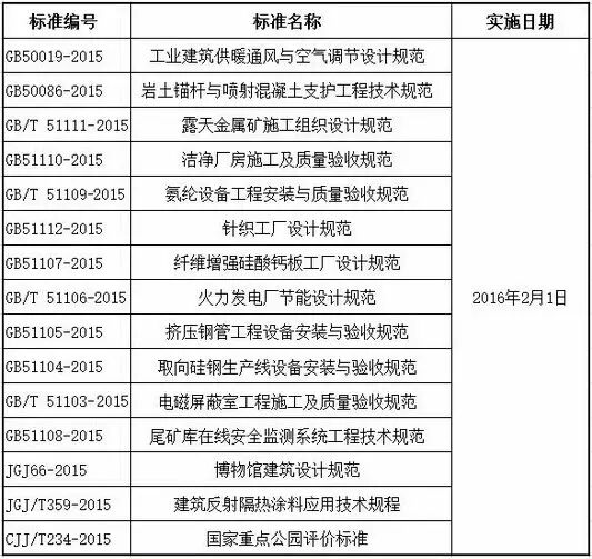 《工业建筑供暖通风与空气调节设计规范》为国家标准,编号为GB50019-2015,自2016年2月1日起实施。其中,第5.4.12、5.5.2、5.7.4、5.8.17、6.1.13、6.2.2、6.3.2、6.3.10、6.4.7、6.9.2、6.9.3、6.9.9、6.9.12、 6.9.13、6.9.15、6.9.19、6.9.30、8.5.6、9.1.2、9.4.4(4)、9.7.12、9.11.3、10.2.12、11.2.11、11.6.7条(款)为强制性条文,必须严格执行。原国家标准《采暖通风与空气调节设计规范》GB50019-2003同时废止。 《岩土锚杆与喷射混凝土支护工程技术规范》为国家标准,编号为GB50086-2015,自2016年2月1日起实施。其中,第4.1.4、4.5.3、12.1.19、13.1.1条为强制性条文,必须严格执行。原《锚杆喷射混凝土支护技术规范》 GB50086-2001同时废止。 《露天金属矿施工组织设计规范》为国家标准,编号为GB/T 51111-2015,自2016年2月1日起实施。 《洁净厂房施工及质量验收规范》为国家标准,编号为GB51110-2015,自2016年2月1日起实施。其中,第4.5.6、5.3.4(6)、5.4.9(2、3)、6.2.5(1)、6.2.9、6.2.10、6.3.4、6.3.5、6.3.6、7.1.3、7.1.5、7.3.1、 7.7.3、7.8.2(1、2)、9.4.4(1、2)条(款)为强制性条文,必须严格执行。 《氨纶设备工程安装与质量验收规范》为国家标准,编号为GB/T 51109-2015,自2016年2月1日起实施。 《针织工厂设计规范》为国家标准,编号为GB51112-2015,自2016年2月1日起实施。其中,第7.7.4、9.5.1条为强制性条文,必须严格执行。 《纤维增强硅酸钙板工厂设计规范》为国家标准,编号为GB51107-2015,自2016年2月1日起实施。其中,第7.2.14、10.2.15、11.3.5、16.8.4条为强制性条文,必须严格执行。 《火力发电厂节能设计规范》为国家标准,编号为GB/T 51106-2015,自2016年2月1日起实施。 《挤压钢管工程设备安装与验收规范》为国家标准,编号为GB51105-2015,自2016年2月1日起实施。其中,第2.0.9、2.0.17、11.1.7条为强制性条文,必须严格执行。 《取向硅钢生产线设备安装与验收规范》为国家标准,编号为GB51104-2015,自2016年2月1日起实施。其中,第2.0.17、11.1.7条为强制性条文,必须严格执行。 《电磁屏蔽室工程施工及质量验收规范》为国家标准,编号为GB/T 51103-2015,自2016年2月1日起实施。 《尾矿库在线安全监测系统工程技术规范》为国家标准,编号为GB51108-2015,自2016年2月1日起实施。其中,第3.1.6条为强制性条文,必须严格执行。 《博物馆建筑设计规范》为行业标准,编号为JGJ66-2015,自2016年2月1日起实施。其中,第4.1.3、4.1.5条为强制性条文,必须严格执行。原《博物馆建筑设计规范》JGJ66-91同时废止。 《建筑反射隔热涂料应用技术规程》为行业标准,编号为JGJ/T359-2015,自2016年2月1日起实施。 《国家重点公园评价标准》为行业标准,编号为CJJ/T234-2015,自2016年2月1日起实施。