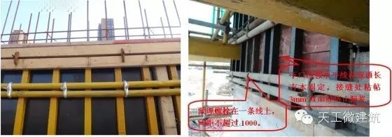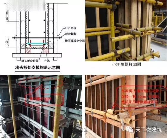 4.1 剪力墙堵头板模板拼缝处应采用方木固定,防止剪力墙阳角漏浆.对于较短剪力墙堵头板建议采用通长螺杆加固,防止剪力墙端头变形、胀模。