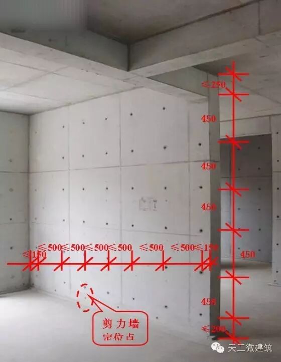 1.1 层高3米的标准层墙体应设置5~6道水平加固螺杆,水平加固螺杆间距不得大于500mm,最底下一道离地不得大于200mm,最上面一道离板底不得大于250mm。