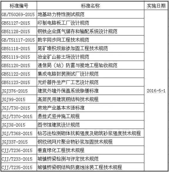 现批准《地基动力特性测试规范》为国家标准,编号为GB/T50269-2015,自2016年5月1日起实施。原《地基动力特性测试规范》GB/T50269-97同时废止。  现批准《印制电路板工厂设计规范》为国家标准,编号为GB51127-2015,自2016年5月1日起实施。其中,第6.2.1、10.1.4、10.2.9、10.6.4、11.3.6条为强制性条文,必须严格执行。  现批准《钢铁企业煤气储存和输配系统设计规范》为国家标准,编号为GB51128-2015,自2016年5月1日起实施。其中,第3.3.2、3.4.1(5)、3.4.2、5.1.7、5.4.2(4)、8.1.11、8.2.6、8.2.10、8.4.1(6、7)、8.4.2(3)、 8.4.3(3)、8.4.7、8.4.10、9.6.1条(款)为强制性条文,必须严格执行。  现批准《数字同步网工程技术规范》为国家标准,编号为GB/T51117-2015,自2016年5月1日起实施。  现批准《尾矿堆积坝排渗加固工程技术规范》为国家标准,编号为GB51118-2015,自2016年5月1日起实施。其中,第3.0.4条为强制性条文,必须严格执行。   现批准《冶金矿山排土场设计规范》为国家标准,编号为GB51119-2015,自2016年5月1日起实施。其中,第7.3.5条为强制性条文,必须严格执行。   现批准《通信局(站)防雷与接地工程验收规范》为国家标准,编号为GB51120-2015,自2016年5月1日起实施。其中,第3.0.1、6.3.2、6.3.4、7.3.1条为强制性条文,必须严格执行。  现批准《集成电路封装测试厂设计规范》为国家标准,编号为GB51122-2015,自2016年5月1日起实施。其中,第5.3.1条为强制性条文,必须严格执行。  现批准《光纤器件生产厂工艺设计规范》为国家标准,编号为GB51123-2015,自2016年5月1日起实施。其中,第4.1.4、5.4.7条为强制性条文,必须严格执行。   现批准《建筑外墙外保温系统修缮标准》为行业标准,编号为JGJ376-2015,自2016年5月1日起实施。其中,第7.1.2、7.1.5、7.1.6条为强制性条文,必须严格执行。  现批准《高层民用建筑钢结构技术规程》为行业标准,编号为JGJ99-2015,自2016年5月1日起实施。其中,第3.6.1、3.7.1、3.7.3、5.2.4、5.3.1、5.4.5、6.1.5、6.4.1、6.4.2、6.4.3、6.4.4、7.5.2、7.5.3、8.8.1条为强制性条文,必须严格执行。原《高层民用建筑钢结构技术规程》JGJ99-98同时废止。  现批准《房地产业基本术语标准》为行业标准,编号为JGJ/T30-2015,自2016年5月1日起实施。原《房地产业基本术语标准》JGJ/T30-2003同时废止。   现批准《悬挂式竖井施工规程》为行业标准,编号为JGJ/T370-2015,自2016年5月1日起实施。  现批准《图书馆建筑设计规范》为行业标准,编号为JGJ38-2015,自2016年5月1日起实施。其中,第6.1.2、6.1.3、6.2.1、6.2.2条为强制性条文,必须严格执行。原《图书馆建筑设计规范》JGJ38-99同时废止。   现批准《钻芯法检测砌体抗剪强度及砌筑砂浆强度技术规程》为行业标准,编号为JGJ/T368-2015,自2016年5月1日起实施。   现批准《钢绞线网片聚合物砂浆加固技术规程》为行业标准,编号为JGJ337-2015,自2016年5月1日起实施。其中,第5.1.5、5.2.8条为强制性条文,必须严格执行。  现批准《垂直绿化工程技术规程》为行业标准,编号为CJJ/T236-2015,自2016年5月1日起实施。  现批准《城镇桥梁检测与评定技术规范》为行业标准,编号为CJJ/T233-2015,自2016年5月1日起实施。  现批准《城镇桥梁钢结构防腐蚀涂装工程技术规程》为行业标准,编号为CJJ/T235-2015,自2016年5月1日起实施。 ·END·