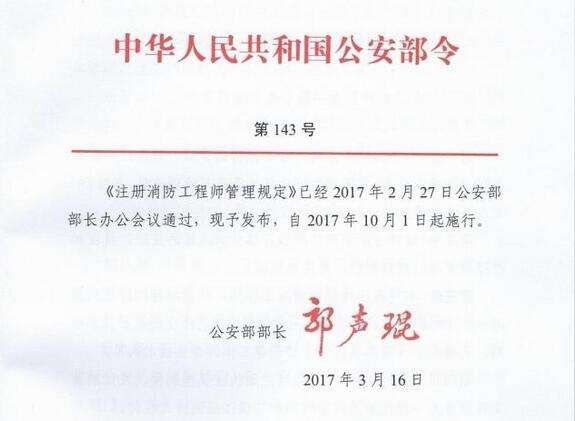 自2015年12月19日注册消防消防工程师首次开考后,注册和执业一直都是考友们迫切关注的现实问题。2017年3月16日,公安部部长郭声琨签发《注册消防工程师管理规定》(中华人民共和国公安部令第143号),该《规定》自2017年10月1日起实施。