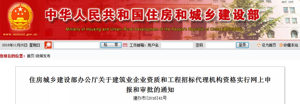 2016年8月31日:住房城乡建设部办公厅关于建筑业企业资质和工程招标代理机构资格实行网上申报和审批的通知,建办市[2016]41号