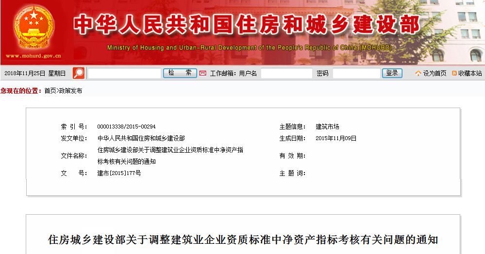 2015年11月11日:住房城乡建设部关于调整建筑业企业资质标准中净资产指标考核有关问题的通知,文号: 建市[2015]177号