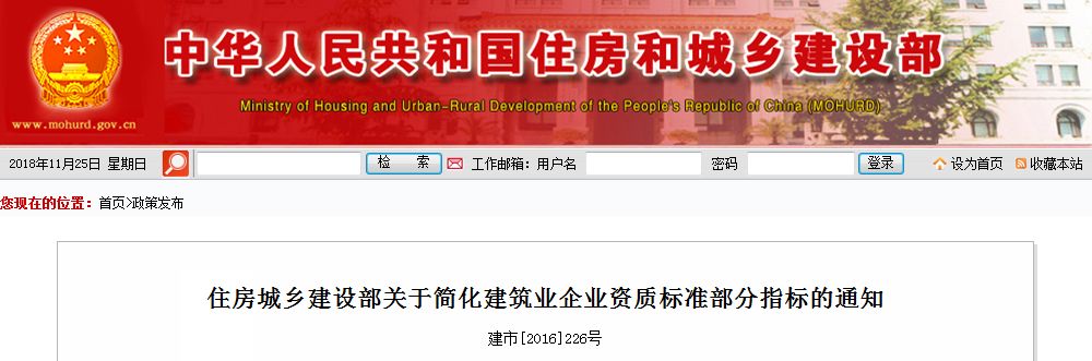 2016年10月19日:住房城乡建设部关于简化建筑业企业资质标准部分指标的通知,建市[2016]226号