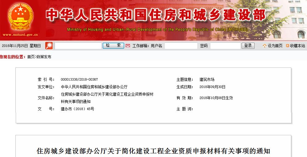 2018年10月18日:住房城乡建设部办公厅关于简化建设工程企业资质申报材料有关事项的通知,文号: 建办市〔2018〕45号