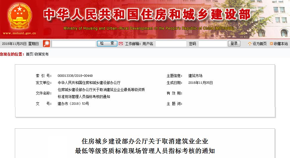 2018年11月14日:住房城乡建设部办公厅关于取消建筑业企业最低等级资质标准现场管理人员指标考核的通知,文号: 建办市〔2018〕53号