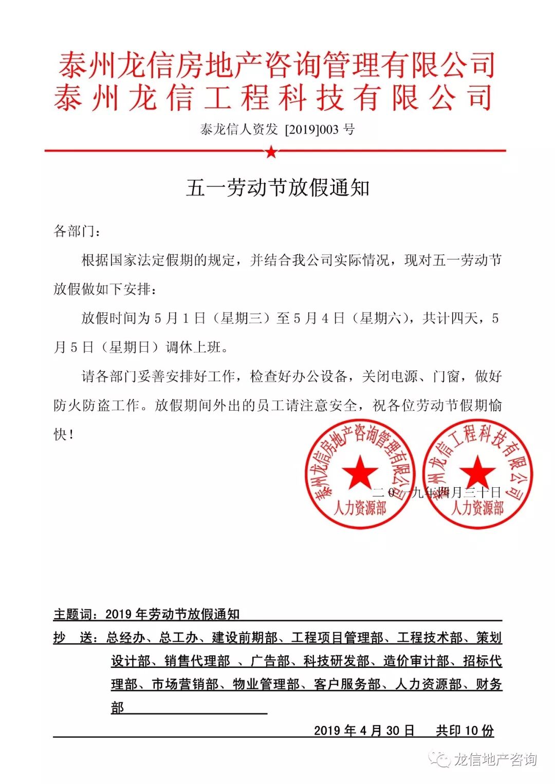 五一劳动节放假通知